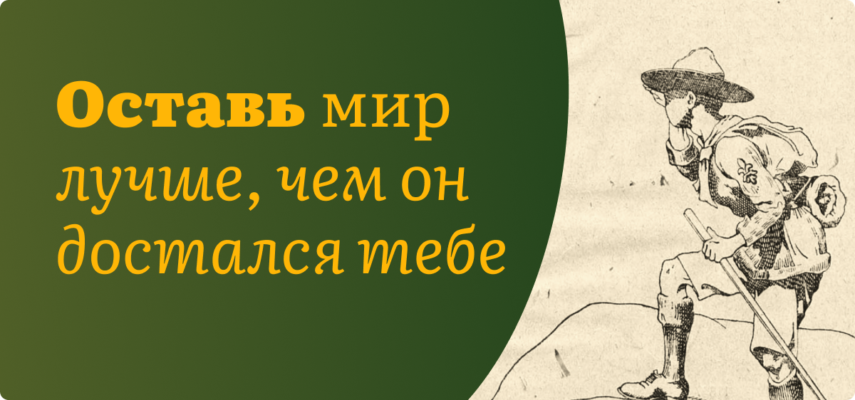 У бойскаутов есть правило: «Всегда оставляй лагерь чище, чем был до тебя». Если ты видишь мусор на земле, ты убираешь его, независимо от того, кто его оставил. Первоначальное правило сформулировал Роберт Баден-Пауэлл, отец скаутского движения: «Постарайся оставить после себя мир лучше, чем ты его нашёл».